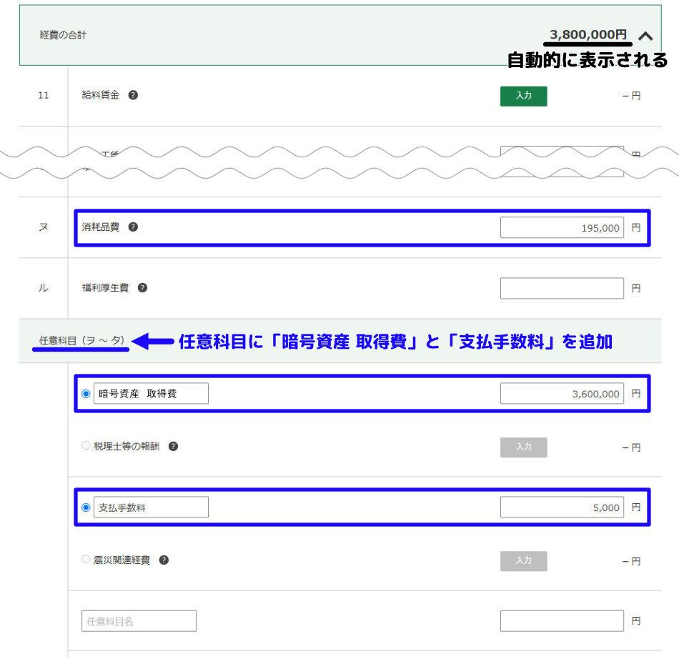 「暗号資産 取得費」と「支払手数料」については該当する項目がないので、任意科目の箇所に新規で項目を追加しています。